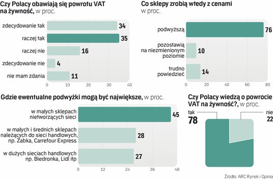 – Zaskoczeniem może być skala obaw o podwyżki cen, w polskiej historii podnoszenie podatków – czy ogółem cen – wiązało się często z dużymi niepokojami społecznymi. Teraz mamy oczywiście inne czasy, niemniej to wciąż silna obawa, zwłaszcza u starszych konsumentów – mówi dr Adam Czarnecki, wiceprezes ARC Rynek i Opinia. – Polacy są oczywiście świadomi mechanizmów rynkowych, dlatego spodziewają się, że wzrost cen najmocniej będzie odczuwalny w małych sklepach. Wojna cenowa Lidla i Biedronki złagodzi skalę wzrostu cen, podobnie może być w innych dużych sieciach – dodaje.