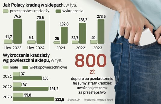 Od października 2023 r. dopiero przekroczenie podczas kradzieży kwoty 800 zł kwalifikuje ją jako przestępstwo, a nie wykroczenie. W efekcie liczba przestępstw, które w I kwartale 2023 r. klasyfikowane były od poziomu 500 zł, rok do roku spadła aż 22 proc. – wynika z danych Komendy Głównej Policji, które „Rzeczpospolita” poznała jako pierwsza.