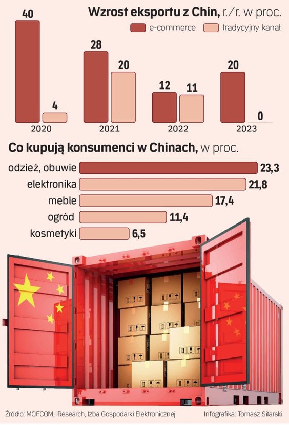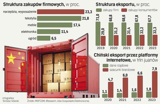 Daje to efekty: chiński eksport przez e-commerce urósł w 2023 r. 20 proc. r./r., choć ten konwencjonalny w zasadzie się nie zmienił. Raport przytacza dane iResearch, według których – choć władze chińskie podają wartość sprzedaży e-commerce w 2023 r. na około 1,83 biliona rmb (ponad 260 mld dol.) – to szacunki analityków wskazują na wartość niemal 7,9 biliona rmb (1,1 biliona dolarów). Nawet jeśli te są również zawyżone, to te z oficjalnych statystyk są zdecydowanie za niskie.