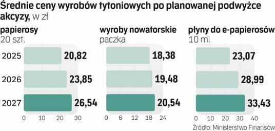 I proponują znacznie mocniejszą podwyżkę stawek. W przypadku papierosów stawki mają wzrosnąć o 25 proc. w 2025 r., 20 proc. w 2026 r. i 15 proc. w 2027 r. Akcyza na wyroby nowatorskie ma pójść w górę odpowiednio o 50 proc., 20 proc. i 15 proc., a na tytoń do palenia o 38 proc., 30 proc. i 22 proc. Drastyczne podwyżki dotkną użytkowników e-papierosów: o 75 proc. w 2025 r., 50 proc. w 2026 r. i 25 proc. w 2027 r. Resort liczy na to, że skutkiem ubocznym będzie odwrót konsumentów od wyrobów tytoniowych, co ma być korzystne dla ich zdrowia.