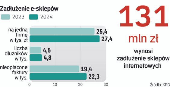 Średnio na jeden zadłużony e-sklep przypada 27,4 tys. zł długu, to o 2 tys. zł więcej niż w analogicznym okresie ubiegłego roku. W ciągu roku przybyło również 268 dłużników i 2941 nieuregulowanych faktur. Obecnie nieuregulowane jest 22,3 tys. zobowiązań 4,8 tys. firm. Rekordzista ma 2 mln zł długu.