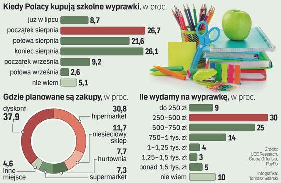 Dodatkowo z badania UCE Research i Grupy Offerista wynika, że 37,9 proc. badanych zrobi lub już zrobiło zakupy szkolne w dyskontach. Na hipermarkety postawi bądź już to zrobiło 30,8 proc. badanych.