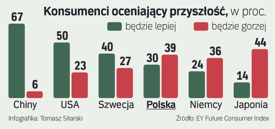 Z najnowszego raportu EY Future Consumer Index wynika, że 69 proc. polskich konsumentów spogląda w przyszłość z obawą. 80 proc. z nas boi się rosnących kosztów życia, a 55 proc. martwi się o stan swoich finansów. – Bardziej zamożne grupy społeczne wykazują większy optymizm w badaniach konsumenckich. Stosunkowo wysoki poziom bieżących dochodów dający częściową odporność na wahania koniunktury oraz wyższa stopa oszczędności wśród tych grup pozwalają im łagodzić ewentualne wahania dochodów, co również wpływa na ich pozytywne nastawienie – mówi Maciej Zdrolik, ekonomista EY.