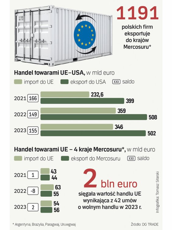 – Tradycyjnie byliśmy pierwszym partnerem handlowym krajów Mercosuru, teraz wyprzedziły nas Chiny – mówi nasz rozmówca z DG Trade. Unia Europejska jest drugim co do wielkości partnerem Mercosuru w handlu towarami (po Chinach) i miała 17 proc. udziału w całkowitym handlu Mercosuru w 2023 r. Natomiast Mercosur jest dziesiątym partnerem UE w handlu towarami. Dlatego umowa z Mercosurem jest ważna dla UE z powodów zarówno gospodarczych, jak i wizerunkowych, bo FTA przyśpieszają wymianę handlową – od wdrożenia FTA eksport do tych krajów rośnie dużo szybciej niż na pozostałe rynki, a to wzmacnia pozycję UE. – UE straciła w Ameryce Południowej swoją dominującą pozycję. Dlatego mam wielką nadzieję, że jeśli zdołamy doprowadzić do podpisania i wdrożenia FTA z krajami Mercosuru, to się zmieni. Dzięki tej umowie mielibyśmy przywileje, ponieważ te kraje tradycyjnie chroniły swój rynek przez bardzo wysokie cła i po wdrożeniu FTA z Unią Europejską nadal będą chronione przez te cła przed innymi partnerami handlowymi, np. przed Chinami – mówi „Rzeczpospolitej” ekspert DG Trade.
