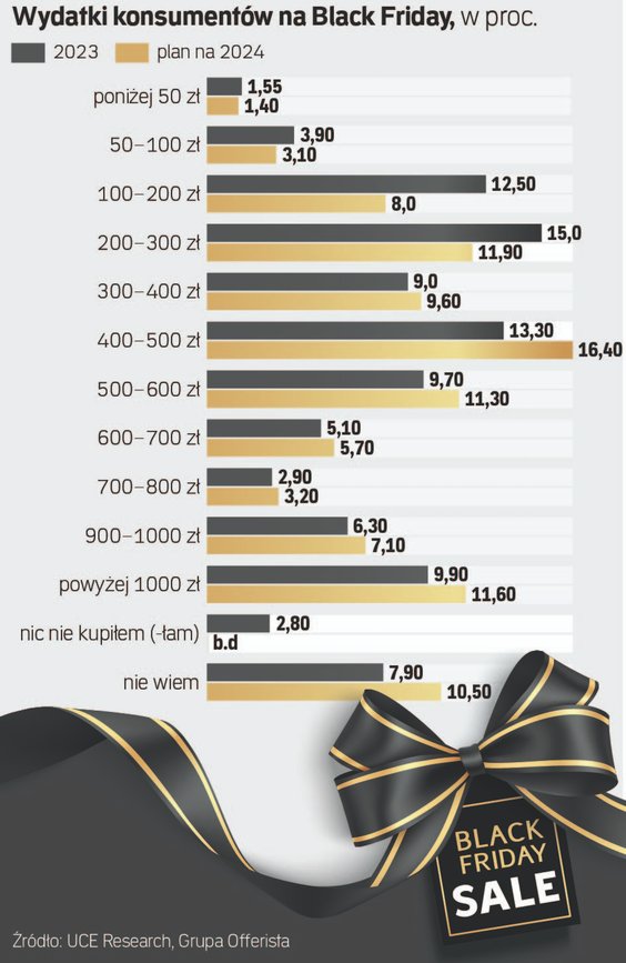 Rok temu 33,9 proc. Polaków wydało w Black Friday kwotę 500–1000 zł, ale w tym roku deklaruje taki poziom już 38,9 proc. – wynika z badania UCE Research oraz Grupy Offerista, które „Rzeczpospolita” poznała jako pierwsza. Dodatkowo firma ID Logistics szacuje, że tegoroczna liczba zamówień może wzrosnąć nawet o 10 proc. r./r. Handel może zatem lekko odetchnąć, ostatnie dane o kiepskiej sprzedaży detalicznej nie napawały optymizmem względem tego okresu.