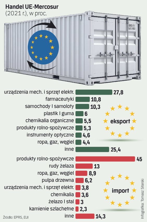 Negocjacje umowy UE–Mercosur trwały 20 lat i pierwotnie zakończyły się w 2019 roku. Z różnych powodów jednak porozumienie nie zostało wtedy podpisane i najpierw UE zażądała od państw Ameryki Południowej zobowiązań w zakresie walki z wylesianiem. A potem tamte kraje przedstawiły dodatkowe postulaty dotyczące ochrony ich rynku przed produktami przemysłowymi. Bo gdy spojrzeć na strukturę handlu między dwoma obszarami, to widać wyraźnie, że w imporcie do UE dominują produkty rolne, a w eksporcie – wyroby przemysłowe. Europejskie firmy mają wielki potencjał, ale nie są wystarczająco – w stosunku do swoich możliwości – obecne na tamtejszym rynku. Jest on bowiem chroniony bardzo wysokimi cłami sięgającymi 20–30 proc., do których dochodzą też bariery podatkowe. W sumie powoduje to, że cena eksportowanego produktu rośnie nawet o 50 proc. Umowa miałaby to zmienić. Podobnie jak w wypadku produktów rolnych, tak i towary przemysłowe miałyby różne okresy przejściowe, klauzule zabezpieczające itp. Ale jednak nastąpiłoby otwarcie tego wielkiego rynku na europejskie produkty. Zdaniem Komisji Europejskiej Polska mogłaby odnieść wymierne korzyści w sektorach, w których już jesteśmy tam obecni i mamy znajomość rynku, czyli np. w eksporcie maszyn i silników, samochodów i traktorów, lekarstw, gumy syntetycznej czy sprzętu medycznego. Polska jest częścią europejskich łańcuchów wartości, w istotny sposób nasi producenci zyskaliby też np. na wzroście eksportu niemieckich towarów przemysłowych. Jeśli chodzi o rolnictwo to – zdaniem KE – Polska szczególnie mogłaby skorzystać na eksporcie alkoholi wysokoprocentowych, czekolady czy słodyczy, a także zbóż.