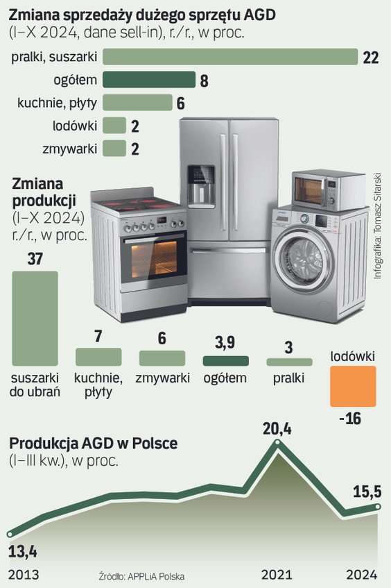 W samym październiku produkcja dużego AGD w Polsce wzrosła o 4,9 proc., zaś od początku roku jest już 3,9 proc. wyższa niż w 2023 r. Do tego sprzedaż od producentów do handlu, czyli tzw. sell-in, w tym roku jest na 8 proc. wyższym poziomie – wynika z danych APPLLiA Polska, organizacji branży AGD. „Rzeczpospolita” poznała je jako pierwsza.