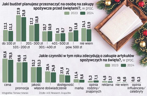 Za większość produktów trzeba zapłacić więcej – mocno w górę poszły choćby ceny warzyw. Podobnie mąki, ale już za mak, grzyby czy oleje roślinne można zapłacić mniej niż w 2023 r. Spadły też ceny ryb – tak karpi, jak i śledzi, na te produkty wiele sieci organizuje spore promocje.