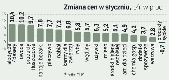 Autorzy badania podkreślają, że w styczniu na 17 monitorowanych kategorii prawie wszystkie były w trendzie wzrostowym, a dynamiki wyniosły od 2,8 proc. do 10,4 proc. W ujęciu rocznym staniała tylko jedna kategoria – o 0,7 proc. spadły ceny produktów sypkich.