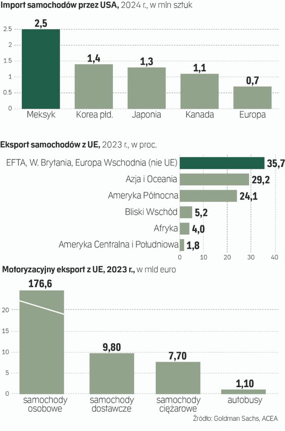 Cła na samochody sprowadzane do USA wzrosną w porównaniu z obecnymi stawkami dziesięciokrotnie. Według Trumpa ma to przynieść wpływy w wysokości 100 mld dol. Jak zakłada amerykańska administracja, dzięki wysokim stawkom celnym zagraniczni producenci samochodów mający fabryki w USA zwiększą w nich produkcję lub zaczną ją tam przenosić. W Stanach Zjednoczonych samochody produkuje m.in. BMW, z którego fabryki w Spartanburgu w Karolinie Południowej wyjeżdża dziennie 1,5 tys. aut, a także Mercedes mający zakłady w Tuscaloosie w Alabamie.
