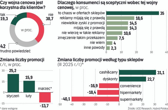 Konsumenci oczywiście chcą wybierać tańsze sklepy, lepsze promocje, by wydawać mniej i oszczędzać. – Wojna na koszyki, z której wybrzmiewało za każdym razem, że to sieć A jest tańsza, a potem w ripoście sieć B udowadniała, że jest tańsza, sprawiły, że klienci – w mojej ocenie – nie wierzą już nikomu. To dla nich dziś pusty komunikat – mówi ekspert.
