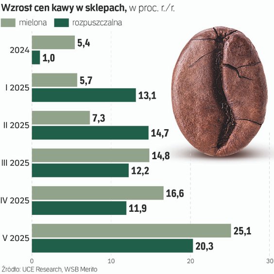 Ceny kawy na światowych rynkach biją rekordy od dawna, ale dopiero teraz widać efekty tego zjawiska na sklepowych półkach. Według danych UCE Research i WSB Merito, które „Rzeczpospolita” poznała pierwsza, w maju średnio kawa mielona zdrożała 25,1 proc., a rozpuszczalna 20,3 proc. W analizie wzięto pod uwagę blisko 2,9 tys. cen detalicznych.