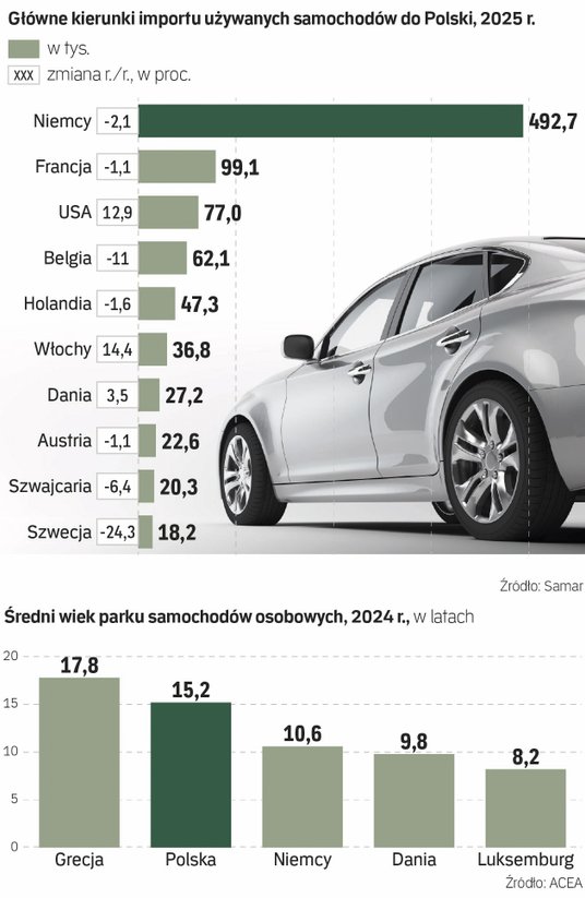 Maleje prywatny import, będący głównym źródłem zasilenia wtórnego rynku: jak podaje Instytut Samar, od stycznia do końca grudnia 2025 r. sprowadzono 855,6 tys. aut, o 2,8 proc. mniej niż rok wcześniej. Prognoza na 2026 r. zakłada dalszy spadek importu, do 840 tys. samochodów.