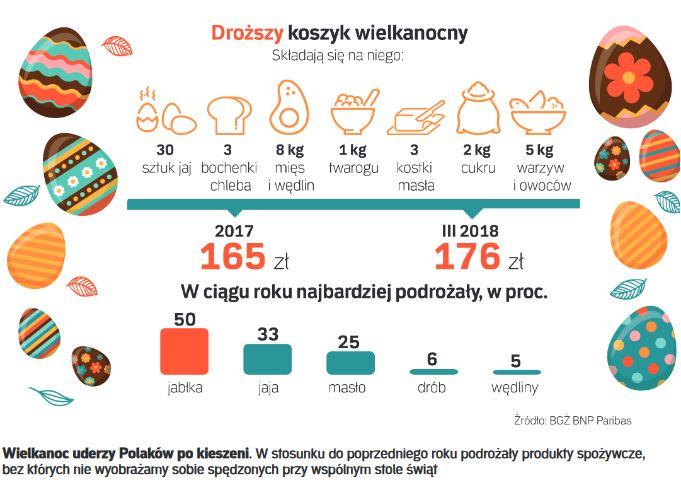 Analitycy włożyli do koszyka typowo świąteczne produkty, jak – trzydzieści sztuk jaj, trzy bochenki chleba, osiem kilo mięsa i wędlin, kilogram twarogu, trzy kostki masła i pięć kilogramów warzyw i owoców oraz dwa kilogramy cukru. Po porównaniu ich cen z cenami przed rokiem, okazało się, że klienci zapłacą za takie zakupy średnio ok. 176 zł czyli blisko o 11 zł więcej niż w marcu 2017 r.