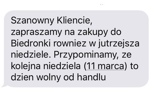 Tekstową wiadomość dostali w sobotę wszyscy ci, którzy zarejestrowali wcześniej kartę rabatową "Moja Biedronka" i podali w tym celu swój numer telefonu. "Szanowny Kliencie, zapraszamy na zakupy do Biedronki również w jutrzejszą niedzielę. Przypominamy, że kolejna niedziela (11 marca) to dzień wolny od handlu" - napisała sieć sklepów.
