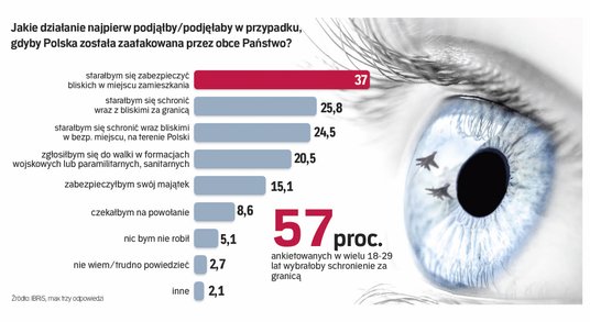Ponad 24 proc. Polaków starałoby się schronić wraz z bliskimi w bezpiecznym miejscu na terenie Polski, aż 37 proc. zabezpieczyć bliskich w miejscu zamieszkania. Na powołanie do wojska czekałoby 8,6 proc. badanych, a 15 proc. zabezpieczyłoby swój majątek. Tylko niewiele ponad 5 proc. badanych nic by nie robiło.