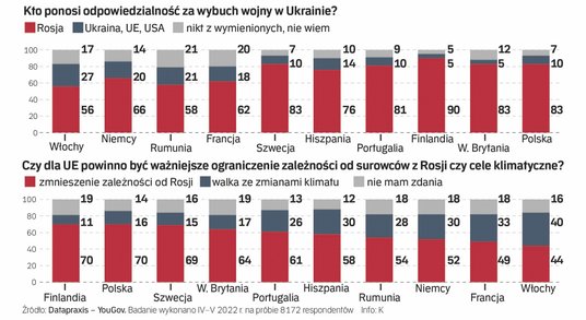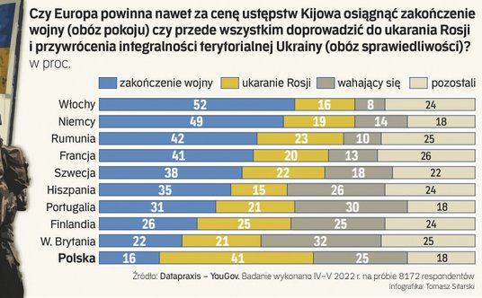 Podzielili ankietowanych na obóz pokoju, obóz sprawiedliwości, wahających się (wahadłowych) i pozostałych. Obóz pokoju, który chce, by zapanował on jak najszybciej nawet kosztem strat terytorialnych Ukrainy na rzecz Rosji, jest najsilniejszy. Choć tylko w jednym kraju, Włoszech, stanowi większość (średnia dla wszystkich badanych 35 proc.). Jednak jedynie w Polsce obóz sprawiedliwości, domagający się ukarania Rosji i odzyskania terytorialnej integralności przez Ukrainę, jest liczniejszy niż obóz pokoju (i to zdecydowanie). Dużą przewagę ten drugi nad pierwszym ma, poza Włochami, także w Niemczech, Rumunii i we Francji.