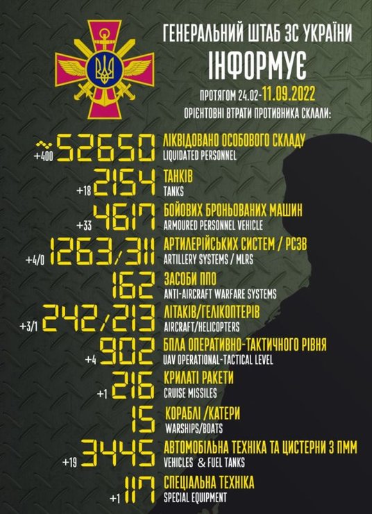 Według strony ukraińskiej zginęło 52 650 rosyjskich żołnierzy, zniszczono też m.in. ponad 1260 systemów artyleryjskich.