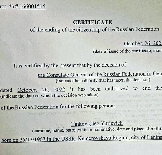 W e wtorek Tińkow opublikował na Instagramie dokument - zaświadczenie o rezygnacji z obywatelstwa rosyjskiego.