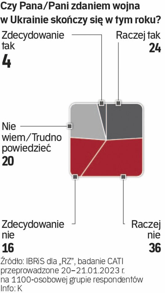 Tak wynika z badania IBRiS dla „Rzeczpospolitej”. Tylko 28,1 proc. badanych jest przekonanych, że w tym roku działania wojenne u naszych sąsiadów zakończą się, przeciwnego zdania jest aż 52,1 proc. pytanych. Pozostali, czyli 19,8 proc., nie ma na ten temat zdania.