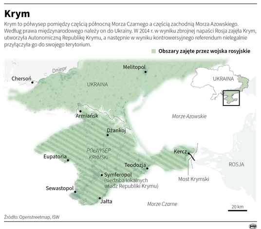Wówczas, w marcu 2014 roku, cały świat zobaczył „zielone ludziki” otaczające budynki rządowe, stacje kolejowe i najważniejsze drogi dojazdowe na Krymie, blokujące ukraińskie jednostki wojskowe. Najpierw Putin się do nich nie przyznawał twierdząc, że takie mundury „można kupić w każdym sklepie wojskowym”, ale już kilka dni później przeprowadził tam „referendum” i ogłosił na placu Czerwonym w Moskwie, że Krym „powraca do ojczystej przystani”.
