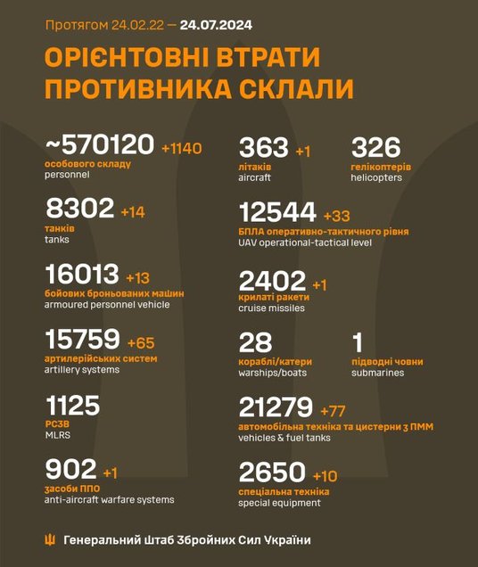 Według strony ukraińskiej w ciągu ostatniej doby Rosjanie stracili 1140 żołnierzy.