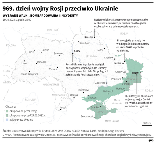 Rosyjskie siły rozpoczęły atak na Szostkę, miasto w obwodzie sumskim, w nocy z 19 na 20 października, używając bomb kierowanych i dronów – poinformowały władze regionalne. Według Mykoły Nohy, burmistrza Szostki, w ataku zginął jeden cywil, a 11 zostało rannych.