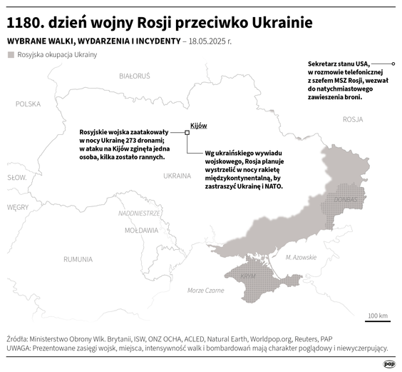 W Watykanie odbyła się uroczysta inauguracja pontyfikatu Leona XIV. Potem nowy papież przyjął prezydenta Ukrainy Wołodymyra Zełenskiego, któremu towarzyszyła żona Ołena. Wcześniej papież zaproponował Watykan jako miejsce, w którym mogłyby się odbyć rozmowy między Rosją a Ukrainą. Zełenski podziękował za audiencję. We wpisie w mediach społecznościowych oświadczył, że głos Stolicy Apostolskiej może odegrać znaczącą rolę w doprowadzeniu do zakończenia wojny. Prezydent Ukrainy wyraził gotowość do dialogu w każdym formacie.