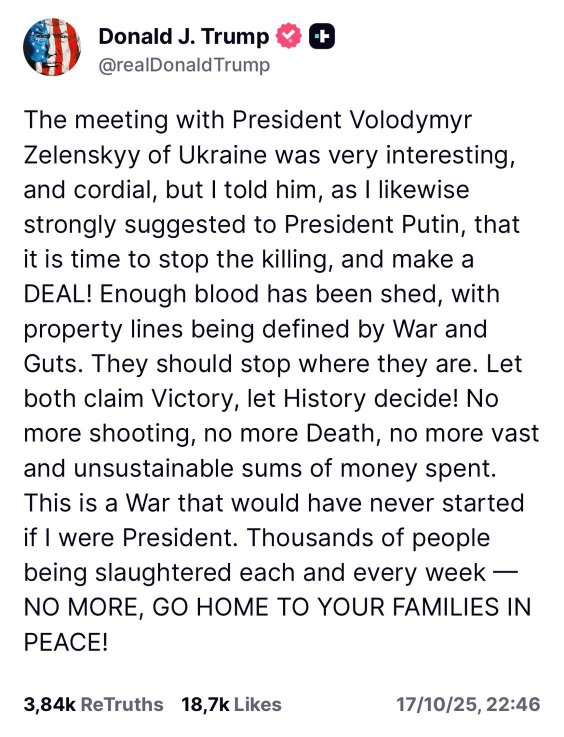 Prezydent USA po spotkaniu z Wołodymyrem Zełenskim, które odbyło się w piątek w Waszyngtonie, zaapelował o zawarcie porozumienia pokojowego i wzywał stronę ukraińską i rosyjską do „zatrzymania się tam, gdzie są”. „Spotkanie było bardzo interesujące i serdeczne, ale powiedziałem mu, podobnie jak prezydentowi Putinowi, że nadszedł czas, aby zaprzestać zabijania i zawrzeć DEAL” – napisał Donald Trump w mediach społecznościowych. „Powinni zatrzymać się w miejscu, w którym się znajdują. Niech obaj ogłoszą zwycięstwo, niech historia zdecyduje! Koniec z walkami, śmiercią i wydawaniem ogromnych, niemożliwych do pokrycia sum pieniędzy. Gdybym był prezydentem, ta wojna nigdy by się nie rozpoczęła. Tysiące ludzi ginie co tydzień – KONIEC Z TYM, WRACAJCIE DO SWOICH RODZIN W POKOJU!!” – zaznaczył polityk.