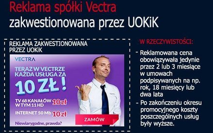 "Wszystko za 10 zł" - tym hasłem spółka Vectra reklamowała swoją ofertę dostępu do telewizji kablowej, internetu i telefonii stacjonarnej. W rzeczywistości atrakcyjna cena obowiązywała tylko przez jakiś czas, a potem klienci musieli płacić znacznie więcej.