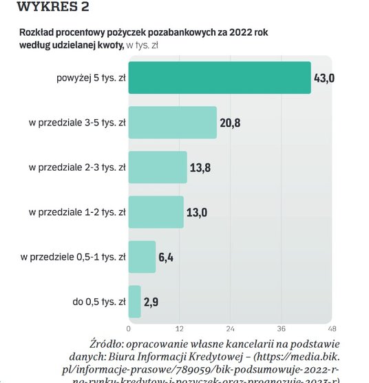 Pożyczki pozabankowe stanowią istotną część rynku. Na polskim rynku działa aż 517 instytucji pożyczkowych.1 Tak duża ilość firm jest odpowiedzią na duże zapotrzebowanie Polaków na łatwo dostępne, niskokwotowe finansowanie, niezbędne do pokrycia bieżących wydatków czy pokrywanie dziur w budżecie domowym. Według danych na koniec 2022 r. firmy pożyczkowe udzieliły 3,6 mln pożyczek na łączną kwotę ponad 9,1 mld zł. W stosunku do 2021 r. wzrosła zarówno ich liczba (+22,9 proc.), jak i wartość (+27,0 proc.).2