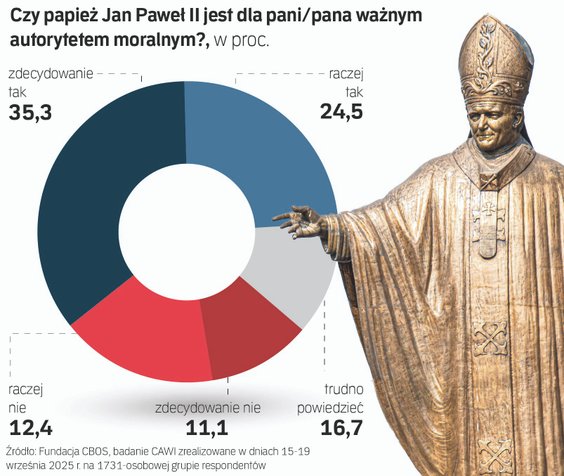 W badaniu, które przeprowadzono teraz, Jana Pawła II za ważny autorytet moralny uznało prawie 60 proc. badanych (59,8 proc.). Niemal w takim samym stopniu za autorytet uznają go mężczyźni (60,4 proc.), jak i kobiety (59,2 proc.). Zrozumiałe, że jest istotnym punktem odniesienia przede wszystkim dla ludzi głęboko wierzących (85,6 proc.), ale także niezdecydowanych (50,7 proc.), czy pewnej grupy religijnie obojętnych (32 proc.).