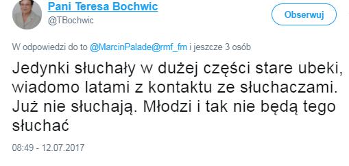 Wpis Teresy Bochwic pojawił się wczoraj na Twitterze w ramach dyskusji o przyczynach rekordowego spadku słuchalności Jedynki Polskiego Radia, która pierwszy raz w historii badań spadła poniżej 8 proc.