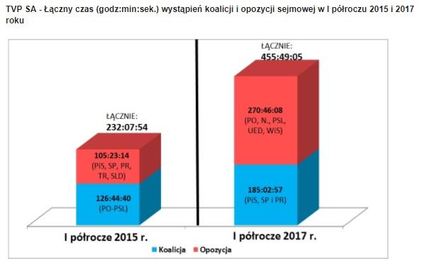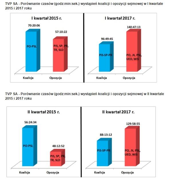 W raporcie porównano czasy wystąpień koalicji i opozycji sejmowej w I kwartale 2015 i 2017 roku. W I kwartale 2015 roku niewielką przewagę (około 13 godzin) miały partie koalicyjne. W tym roku opozycja miała prawie 44 godziny czasu antenowego więcej. W raporcie nie brano pod uwagę stowarzyszeń, np. Kukiz'15 czy wystąpień Prezydenta RP, Prezesa Rady Ministrów czy Marszałków Sejmu i Senatu.