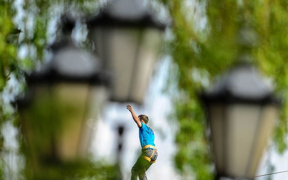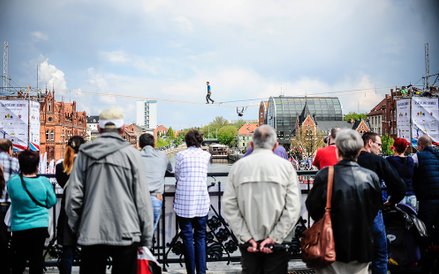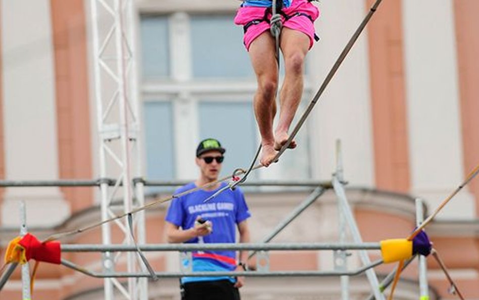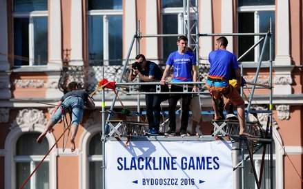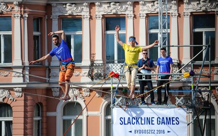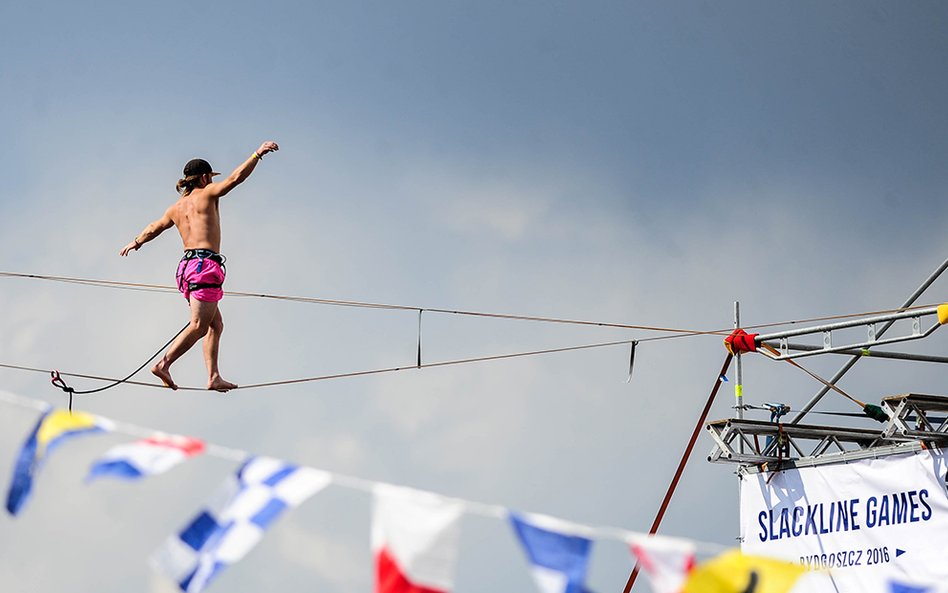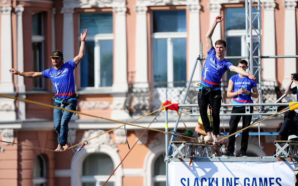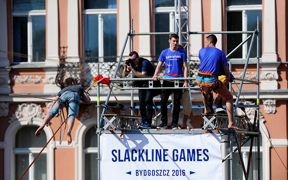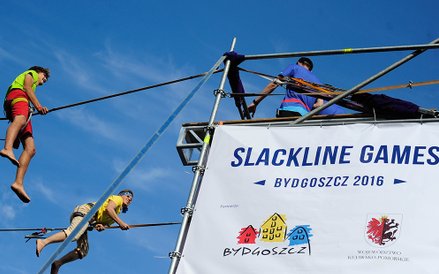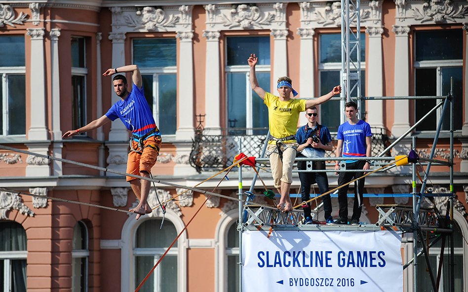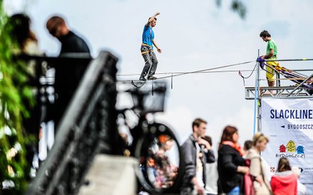 Mistrzostwa Świata w Przechodzeniu przez Rzekę to zawody, które od dwóch lat odbywają się w Bydgoszczy. Zawsze w majówkę. Przyciągają amatorów slackline'u, dyscypliny, która polega na chodzeniu po taśmach rozwieszonych na wysokości. Zobacz zdjęcia Romana Bosiackiego.