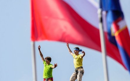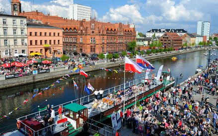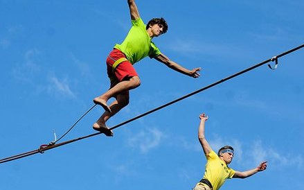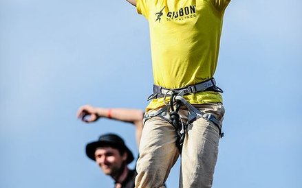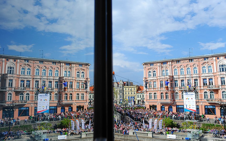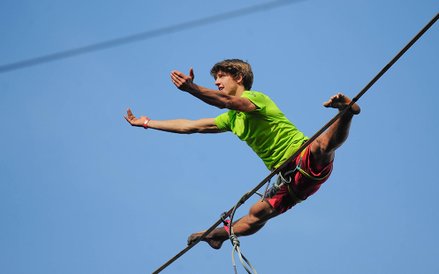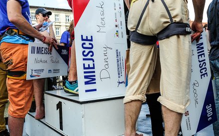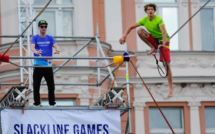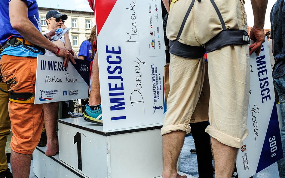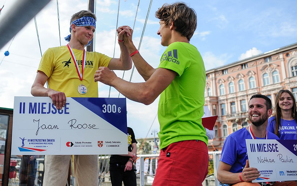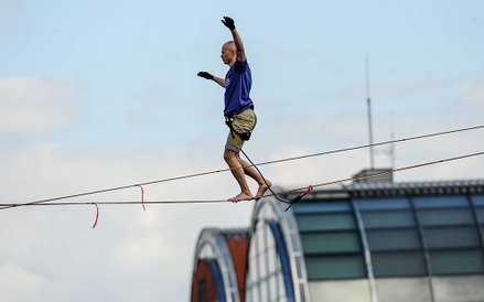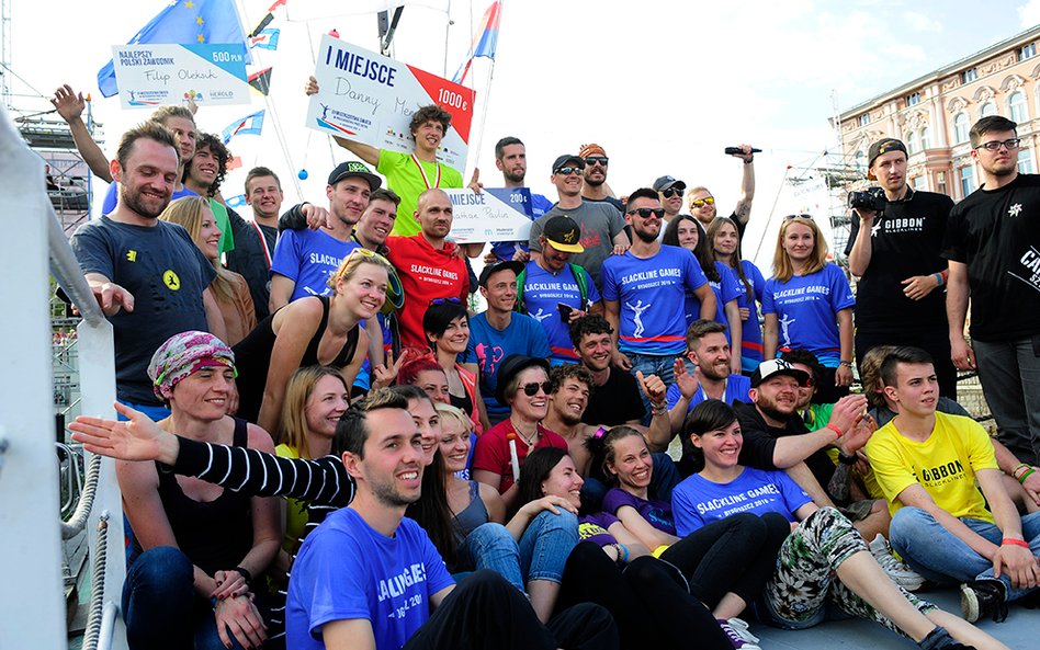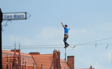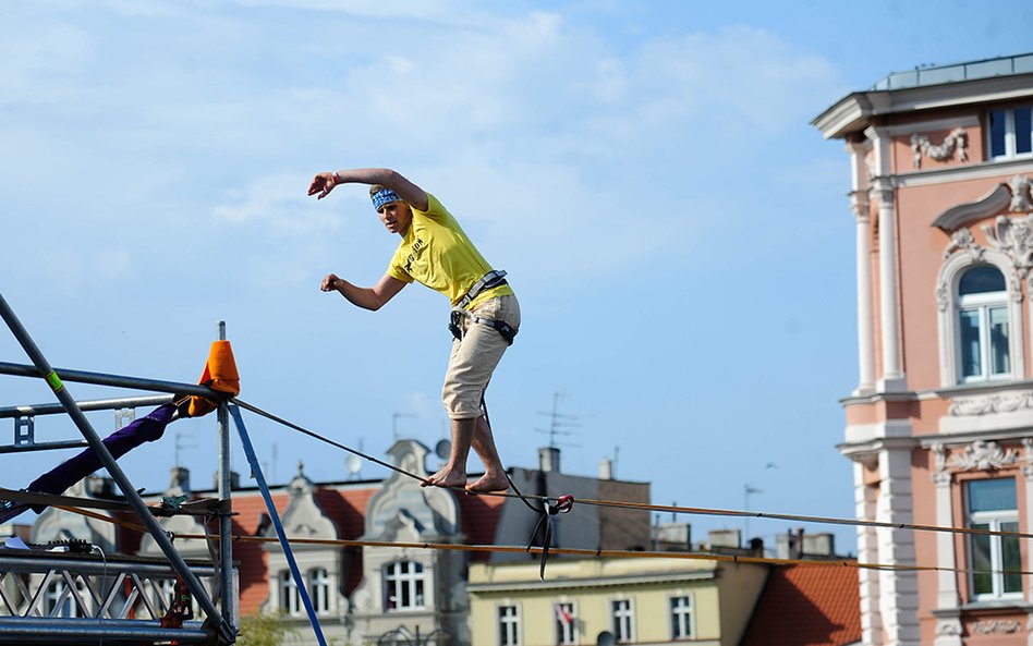 Mistrzostwa Świata w Przechodzeniu przez Rzekę to zawody, które od dwóch lat odbywają się w Bydgoszczy. Zawsze w majówkę. Przyciągają amatorów slackline'u, dyscypliny, która polega na chodzeniu po taśmach rozwieszonych na wysokości. Zobacz zdjęcia Romana Bosiackiego.