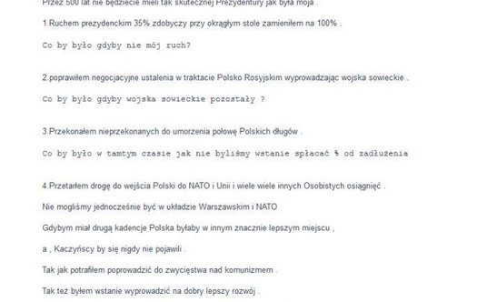Dodatkowo na jednym z portali społecznościowych Lech Wałęsa wypunktował osiągnięcia swojej prezydentury, w tym wyprowadzenie wojsk rosyjskich i przetarcie drogi Polski do NATO, z naciskiem podkreślając, że gdyby dano mu sprawować władzę przez kolejna kadencję, "Polska byłaby dziś w zupełnie innym miejscu".