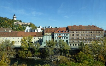 Na prawym brzegu rzeki wznosi się góra Schlossberg o wysokości 473 m n. p. m. Można na nią wjechać kolejką lub windą, zamontowaną w szybie wykutym w skale, albo wspiąć się po stromych schodach.