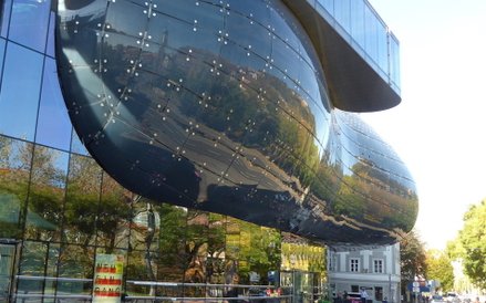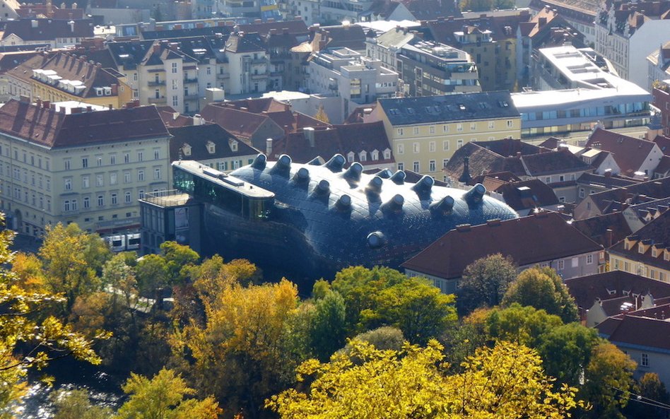Bryła Ktego budynku przypomina gigantyczną nieforemną bańkę mydlaną, która ma jednak odczuwalną masę i ciężar, przez co budzi skojarzenia z abstrakcyjnie oddaną sylwetką wieloryba. Obiekt bywa także nazywany przyjaznym kosmitą, bo wygląda jak z innej planety, a zarazem konstrukcyjnie łączy się z elewacją tzw. Żelaznego Domu z połowy XIX wieku (w tamtym czasie najnowocześniejszego budynku Europy) Kunsthaus powstał w 2003 roku, kiedy Graz został Kulturalną Stolicą Europy. Zaprojektowali go Brytyjczycy Peter Cook i Colin Fournier, którzy wygrali międzynarodowy konkurs architektoniczny, pokonując 102 zespoły z całego świata. Budynek stoi nad brzegiem rzeki Mury, a po jej drugiej stronie wznosi się Schlossberg – Wzgórze Zamkowe. Panoramiczny widok na nie i położone u podnóża Stare Miasto rozpościera się z najwyższej trzeciej kondygnacji Domu Sztuki. A fragment Wzgórza, niczym malarski obraz, można kontemplować też przez jeden ze spiralnych świetlików w położonej piętro niżej w przestrzeni wystawienniczej. Parter budowli, podobnie jak jej szczyt jest w pełni transparentny. Na zewnątrz szklana powłoka w dzień połyskuje błękitnie, a nocą dzięki elektronicznie sterowanemu oświetleniu może zmieniać kolory i kompozycje.