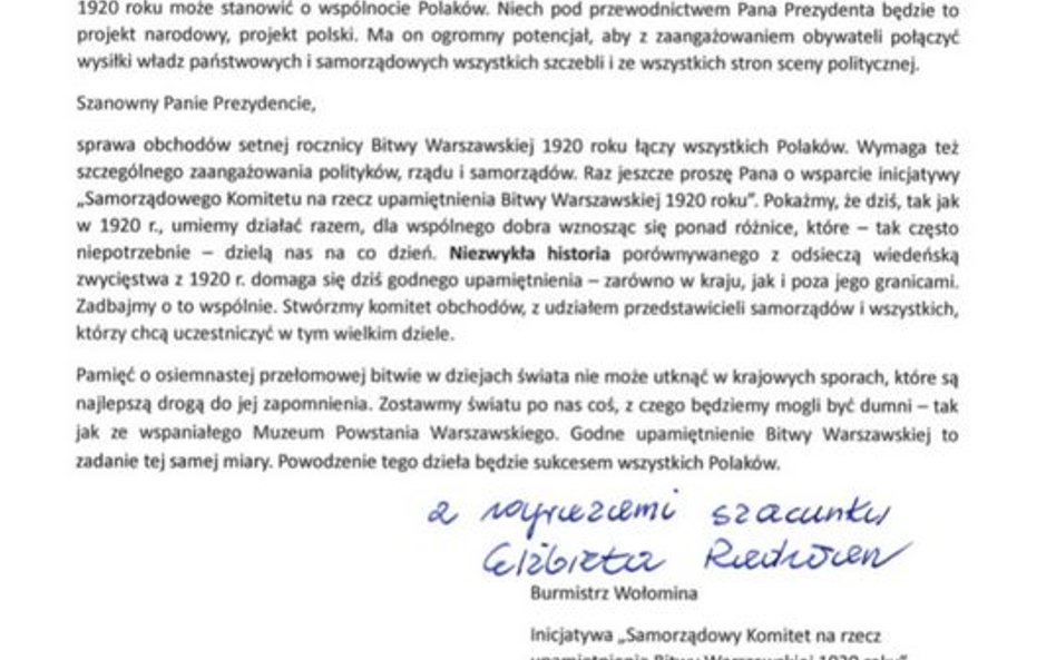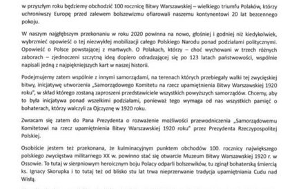 Inicjatorzy akcji zwracają się do prezydenta Andrzeja Dudy „o rozważenie możliwości przewodniczenia" tej inicjatywie. W piątek taki list zostanie wysłany do Kancelarii Prezydenta RP. Burmistrz Wołomina zakłada, że kulminacyjnym punktem obchodów będzie otwarcie Muzeum Bitwy Warszawskiej w Ossowie.