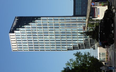 Jego nieregularna bryła zmienia się zależnie od perspektywy, z której na nią się patrzy. Raz bywa jasna, raz ciemna, smukła, sięgająca nieba albo rozszerzająca niczym żagiel. Z dala wygląda jak ścięta piramida. Jedna krawędź od strony hotelu Sheraton przypomina pnące się tarasowo schody, inne ściany modyfikują wcięcia i skosy.