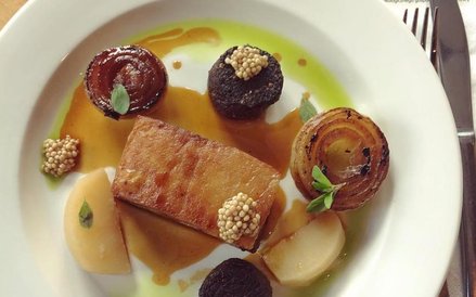Posiłek warto rozpocząć od delikatnego w smaku rillette z królika, podawanego z czereśniami, pistacjami i musztardą sporządzoną na bazie winogron. Warta zainteresowania jest także, nieczęsto goszcząca na naszych stołach seriola, skojarzona z kalarepką i nasturcją. Na większy apetyt warto zamówić aromatyczną kaczkę z morelami i koprem włoskim, wzbogaconą nutą wanilii.