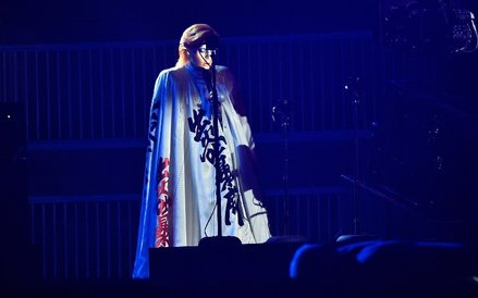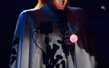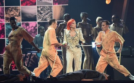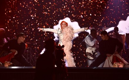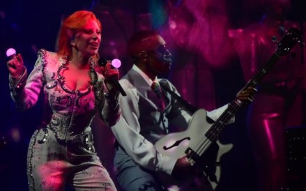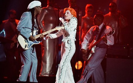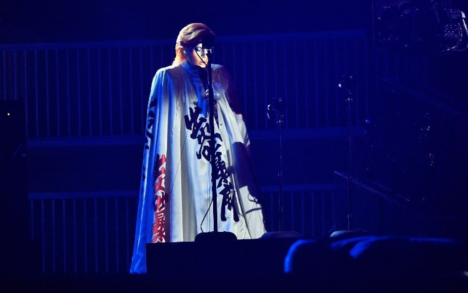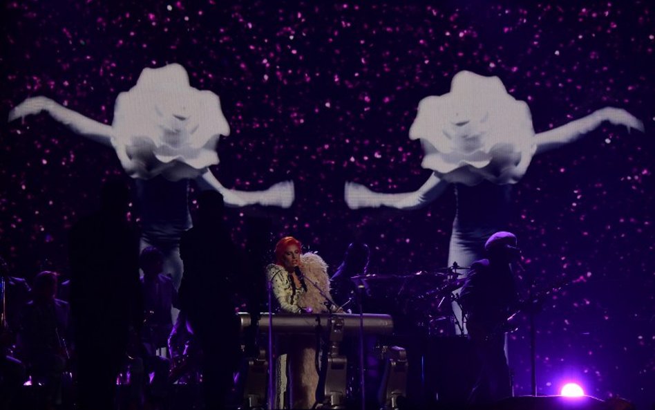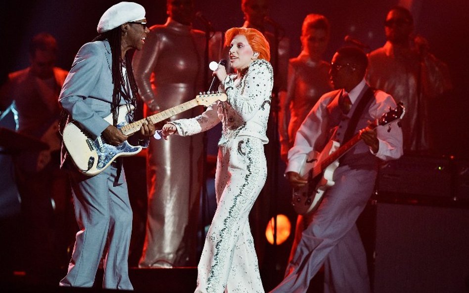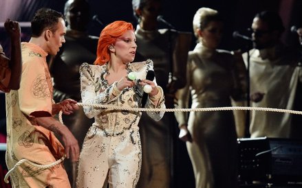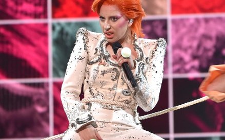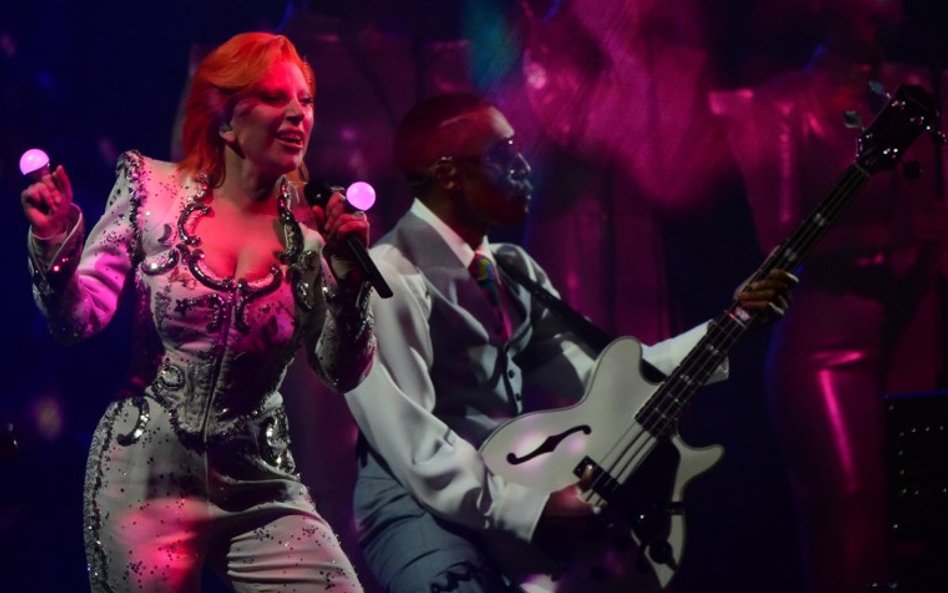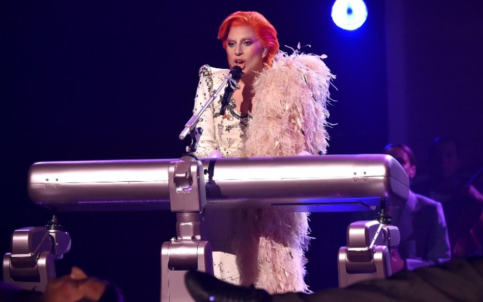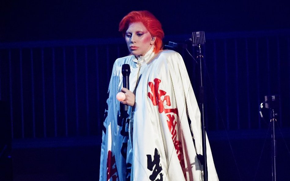 Lady Gaga wystąpiła na scenie w rudej peruce, ostrym makijażu inspirowanym stylizacjami Davida Bowiego i w biały stroju.