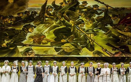 Dwie sceny są szczególnie ważne w „Strasznym dworze" w Operze Narodowej. Pierwsza to prolog, sugestywnie rozpoczęty obrazem „Cud nad Wisłą" Jerzego Kossaka. Rozgrywa się w koszarach, w których żołnierze po zwycięskiej wojnie 1920 r. szykują się do powrotu do domów.