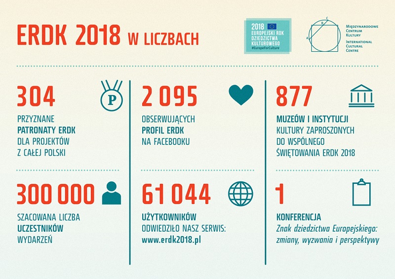 Jak powiedział komisarz UE ds. edukacji, kultury, młodzieży i sportu Tibor Navrascisc, dziedzictwo kulturowe to więcej niż pamięć o przeszłości – to klucz do naszej przyszłości. Stąd też hasło Roku: „Dziedzictwo: tu przeszłość spotyka się z przyszłością”, pod którym w całej Unii Europejskiej zorganizowano tysiące wydarzeń i inicjatyw związanych z dziedzictwem kulturowym. Przez cały rok przyczyniały się one do uwidocznienia bogactwa kulturowej spuścizny Europy, ukazując jego znaczenie w umacnianiu poczucia wspólnej tożsamości i budowaniu przyszłości. Również instytucje i organizacje z Polski włączyły się w obchody święta dziedzictwa kulturowego. Międzynarodowe Centrum Kultury w Krakowie, które decyzją Ministra Kultury i Dziedzictwa Narodowego zostało koordynatorem ERDK 2018 w Polsce, do udziału w Roku zaprosiło wszystkich: osoby indywidualne, organizacje pozarządowe, samorządy i instytucje zajmujące się dziedzictwem kulturowym. Do niemal 1000 podmiotów zwrócono się bezpośrednio, zachęcając do uczestnictwa w obchodach.