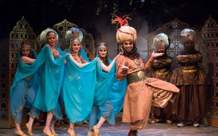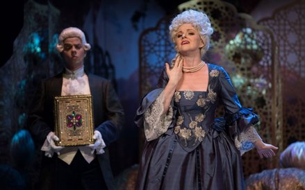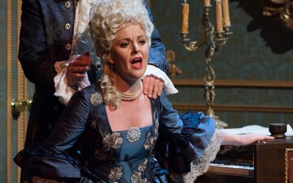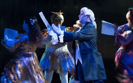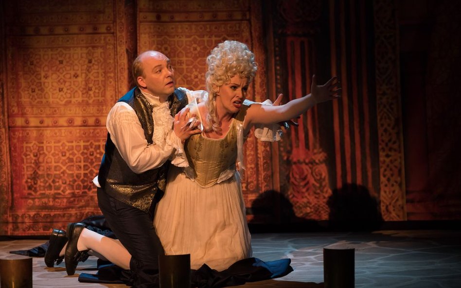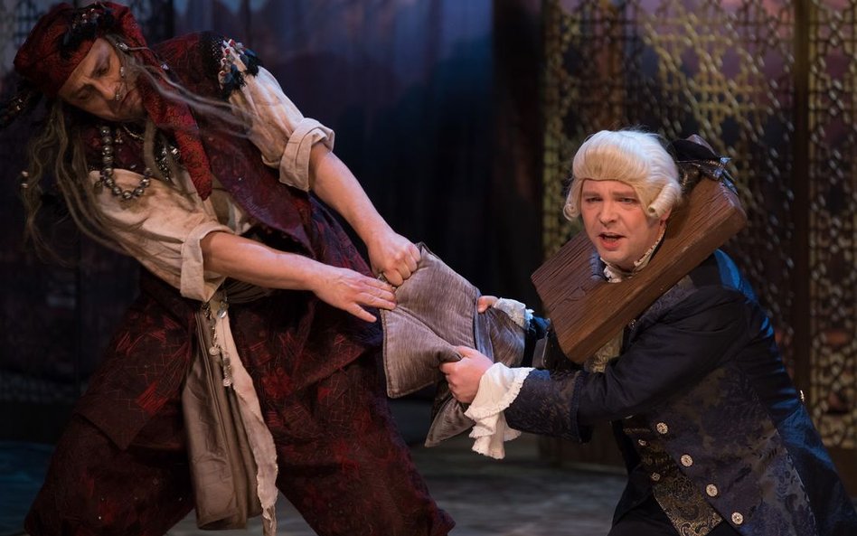 W dziejach Warszawskiej Opery Kameralnej takiego tłoku na scenie jeszcze nie było: pląsające niewolnice, tancerka w stroju pozłacanej fontanny, eunuch, żołnierze, ucięte głowy na dzidach, klawesyn i palma, a nawet Mozart z żoną i dwójką małych dzieci.