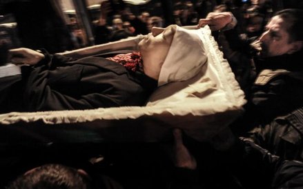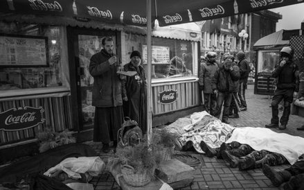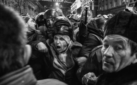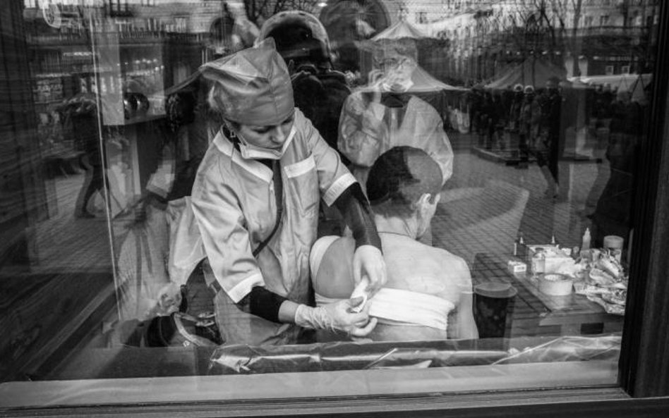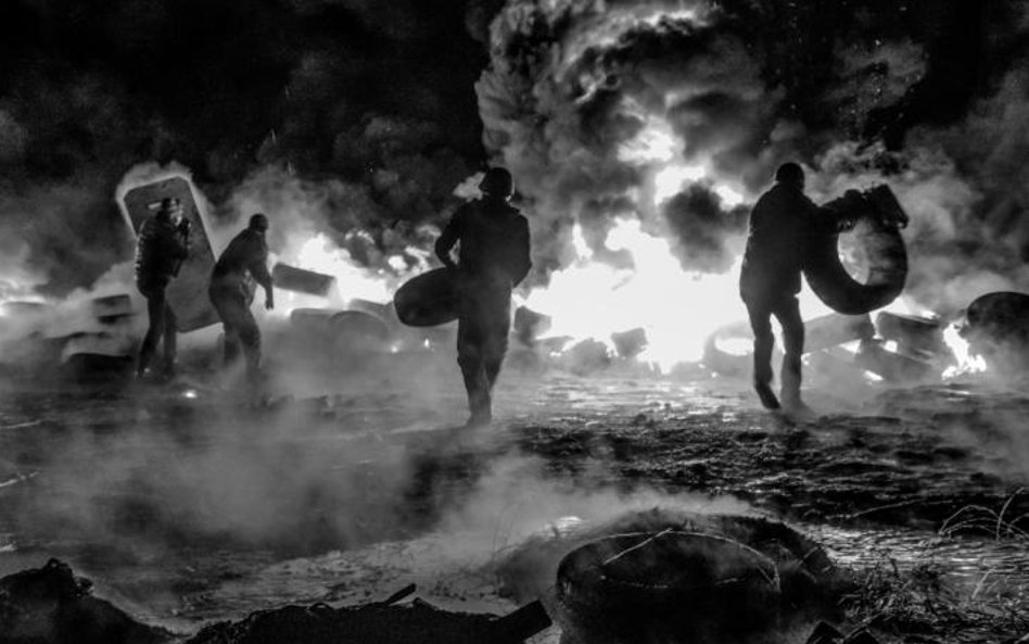 Z tysięcy zdjęć, które przywiozłam z Kijowa, na konkurs musiałam wybrać kilka. Starałam się, żeby pokazywały najważniejsze momenty z wydarzeń na Majdanie. Dwa zdjęcia pochodzą z kulminacyjnego czarnego czwartku 20 lutego, gdy podczas zaciekłych walk zginęło około 70 osób. To z sanitariuszką opatrującą rannego chłopca i ciałami ofiar leżącymi na ziemi, nad którymi stoi pop z  krzyżem. Są też zdjęcia, które zrobiłam wcześniej, gdy w czasie względnego spokoju godzinami rozmawiałam na barykadach z protestującymi, którzy strzegli Majdanu. A po czarnym czwartku rejestrowałam obrzędy pogrzebu z wystawieniem ciał i pożegnaniem. W moim fotoreportażu są i inne dramatyczne sceny, jak palenie opon na barykadzie przy Hruszczewskiego. Protestujący palili je przez trzy dni bez przerwy, aby zasłona dymna ograniczała widoczność berkutowcom i nie mogli celować w obrońców Majdanu. Zdjęcie z krzyczącym mężczyzną zrobiłam nocą, gdy dwa autokary z wojskami wewnętrznymi próbowały przebić się na Majdan. Zostały zatrzymane, a ojciec Paweł wskoczył na dach autobusu z krzyżem, wołając: – Wy jesteście Ukraińcami i my jesteśmy Ukraińcami. O co walczycie?! I oni w końcu go usłuchali i opuścili autokary.