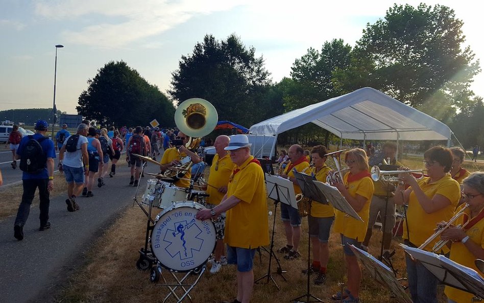 Biorący udział w marszu żołnierze nocują w specjalnym obozie, jacy Holendrzy przygotowują na kilka tygodni przed imprezą. Każda nacja opowiada o życiu w tym miejscu w inny sposób. Szwajcarzy twierdzą, że Duńczycy piją, Niemcy śpią, a oni tańczą. Duńczycy uważają, że to właśnie Szwajcarzy piją najwięcej i przez to potem w dzień cienko śpiewają. Niemcy twierdzą, iż najmniej zdyscyplinowani są Amerykanie i cud, że któryś z nich w ogóle dociera do mety. Amerykanie zaś niczym się nie przejmują i na trasie chętnie przytulają piękne dziewczyny, które na każdym kilometrze stoją z transparentami „DARMOWE UŚCISKI”.