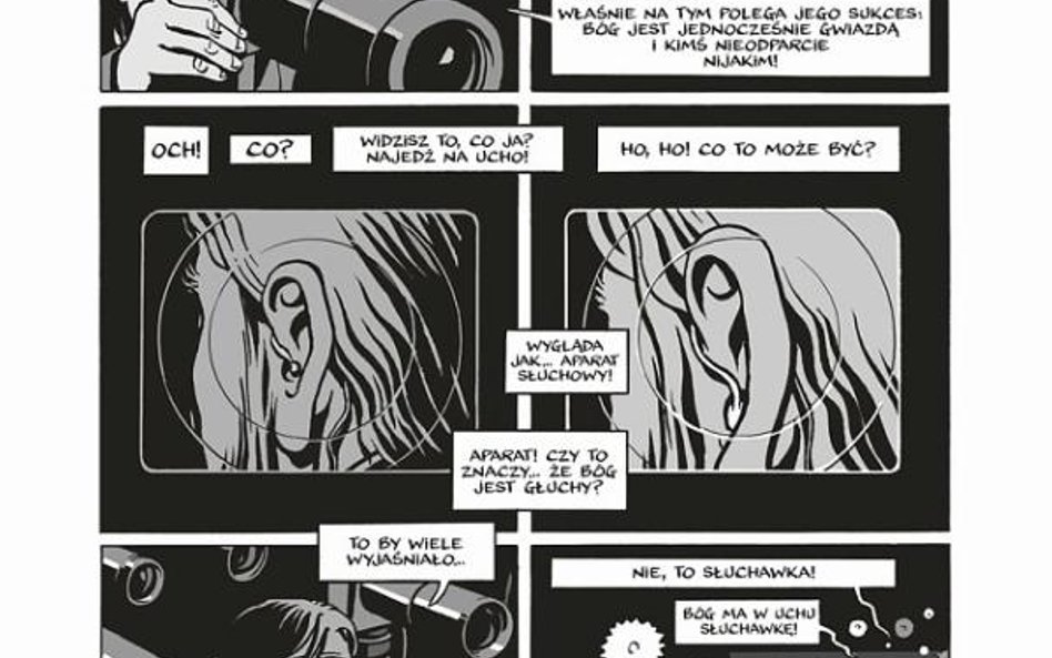 „Bóg we własnej osobie" to strzał w dziesiątkę. W obecnej sytuacji w Polsce, na świecie... Jedni wystawiają wszystko na sprzedaż, inni oddają życie za wiarę. Z jednej strony terroryzm uświęcony religią, z drugiej — destrukcja wartości. Fanatyzm kontra cynizm. I oto francuski autor Marc-Antoine Mathieu (rocznik 1959) podejmuje gorący temat: tworzy bajkę-moralitet. W pewnym mieście pojawia się ten, do którego można mieć pretensje za cały bałagan. Właśnie zarządzono spis ludności (aluzja do Ewangelii). W długiej kolejce ustawia się brodaty, długowłosy facet. Indagowany przez urzędników, podaje swoje dane: Bóg BÓG.