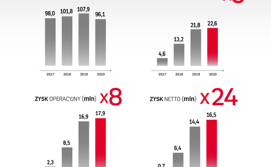 Pełną skalę poprawy sytuacji finansowej grupy widać na przestrzeni ostatnich trzech lat. Skorygowany wynik EBITDA w 2020 r. wyniósł 22,6 mln zł - pięć razy tyle, co w 2017 r., a zysk operacyjny - osiem. Zysk netto zwiększył się skokowo z poziomu 0,69 mln zł trzy lata wcześniej do 16,5 mln zł w 2020 r.